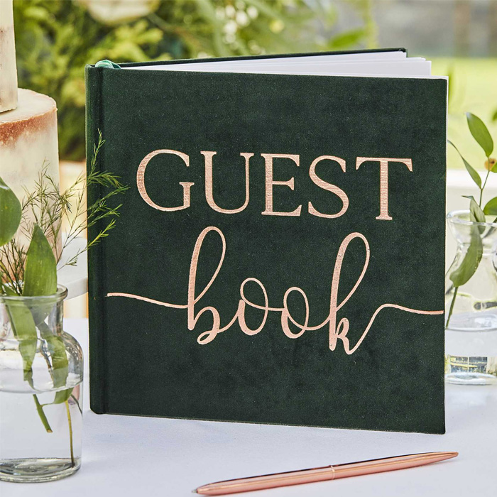 Gæstebogen i grøn velour er den perfekte løsning til, at indsamle hilsner og minder fra dine gæster. Den kompakte størrelse på 21 x 21 cm gør den ideel til enhver festlig anledning.