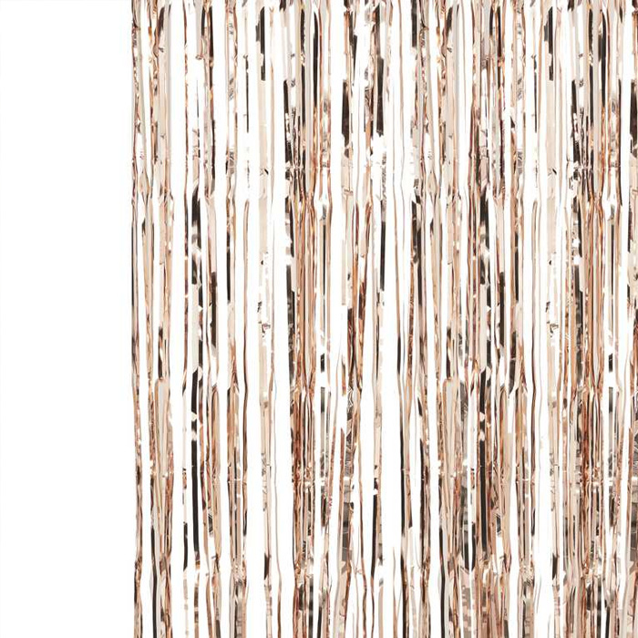 Rosen Guld Frynse Gardin er det perfekte valg til din fest. Dette stilfulde gardin måler 2.5 x 1 meter og bringer en luksuriøs rosaguld nuance ind i dit arrangement.